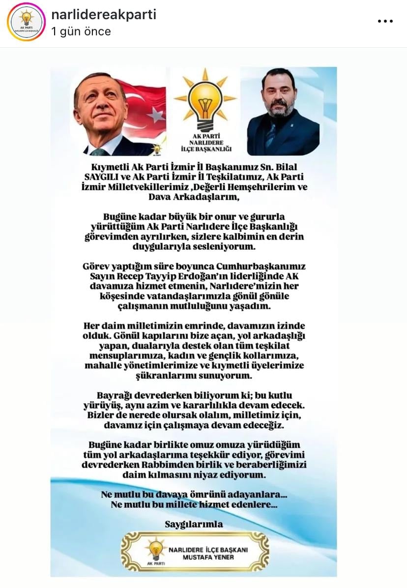 Narlıdere İlçe Başkanı Mustafa Yener Instagram üzerinden istifa haberini bir paylaşımla duyurdu.