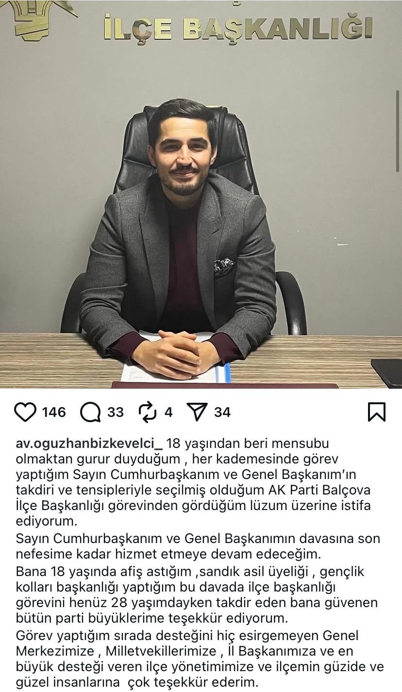 Balçova İlçe Başkanı Oğuzhan Bizkevelci de istifasını sosyal medya üzerinden duyurdu.