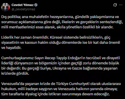 Ülkemizin Cumhurbaşkanı Yardımcısı Cevdet Yılmaz, ABD’nin Venezuela’ya yönelik müdahalesi hakkında önemli açıklamalarda bulundu. Bu bağlamda, dış politikada “milli menfaat” vurgusuna dikkat çekti.