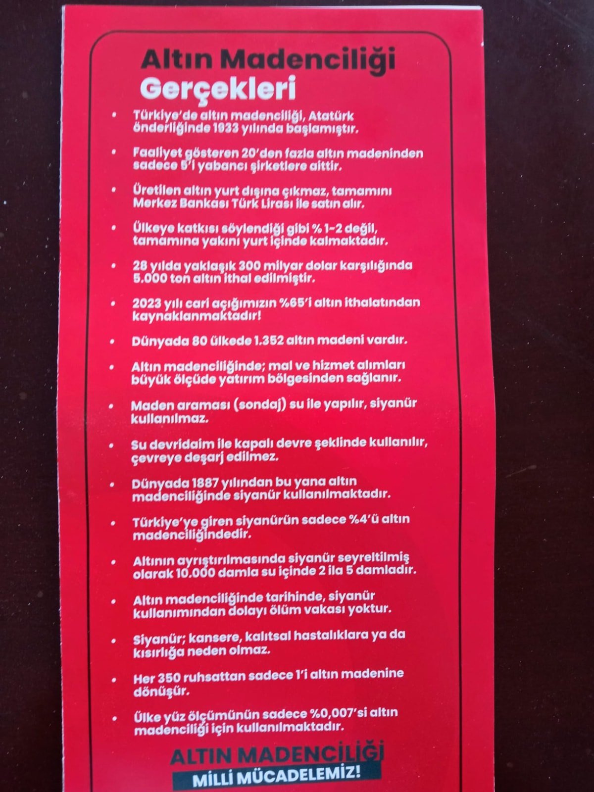Cengiz’in bastırıp dağıttığı broşürde altın madenciliği ve siyanürlü işlemler savunuluyor. Atatürk’ün fotoğrafına da yer verilerek Ulu Önder’i milli politikaları istismar ediliyor. Broşürde şöyle deniliyor: