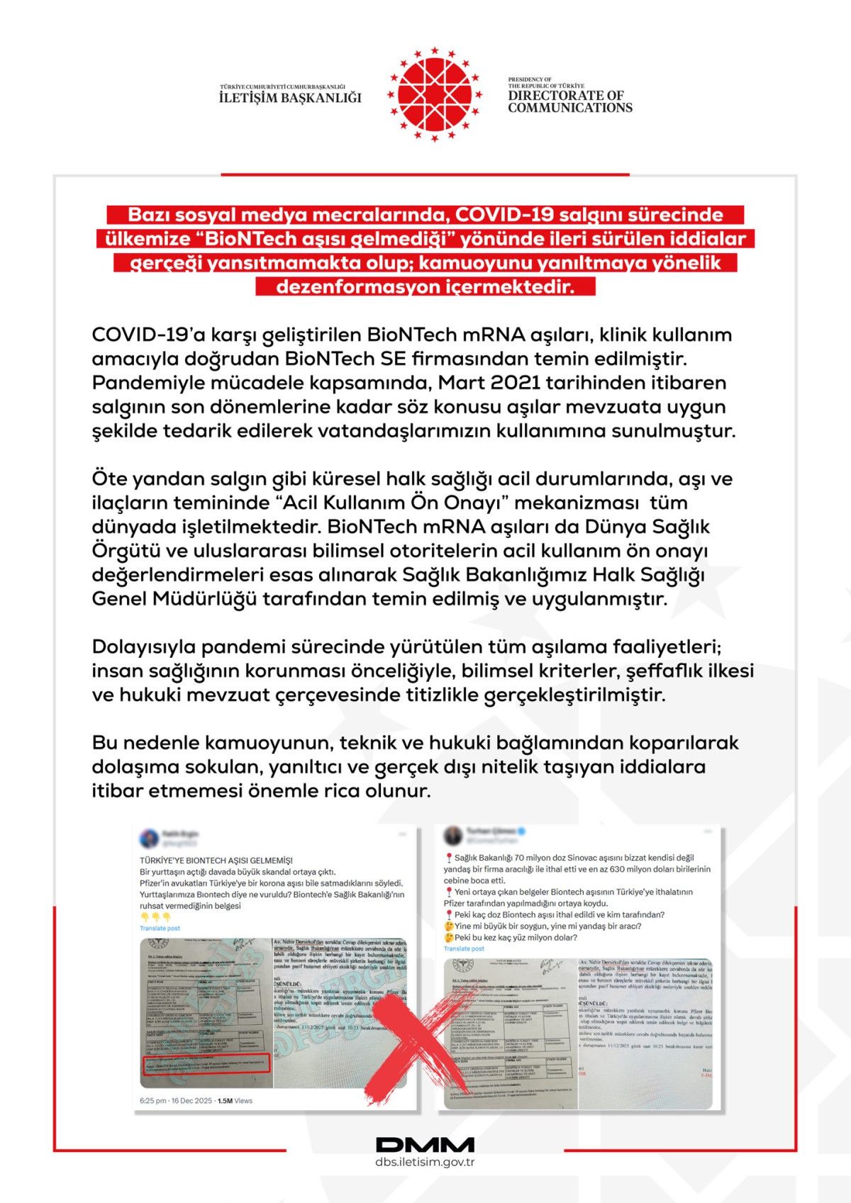DMM’den yapılan açıklamada, bazı sosyal medya mecralarında yer alan, “Covid-19 salgını sürecinde BioNTech aşısı gelmediği” yönündeki iddiaların gerçeği yansıtmadığı ve kamuoyunu yanıltmaya yönelik dezenformasyon içerdiği belirtildi.