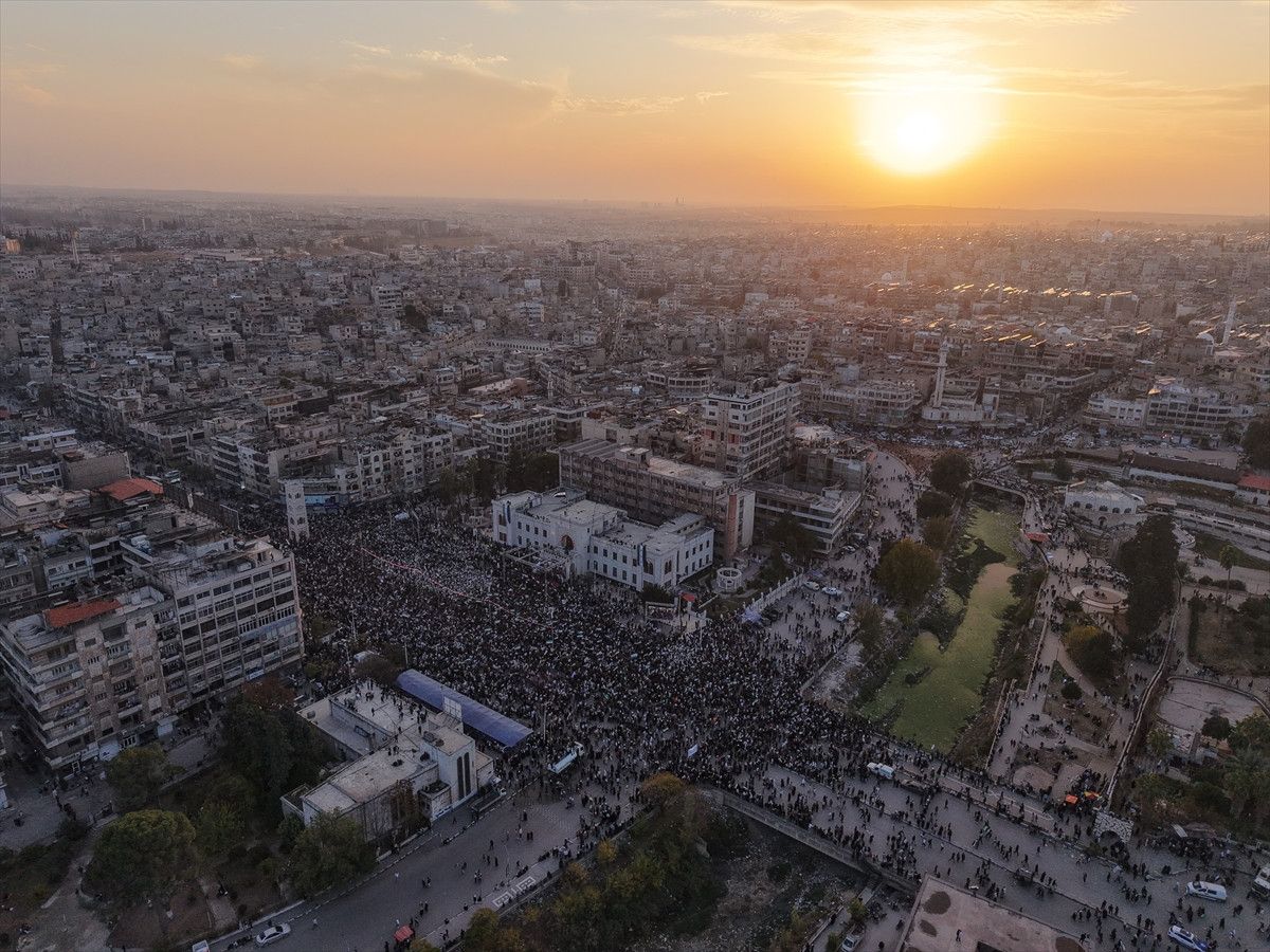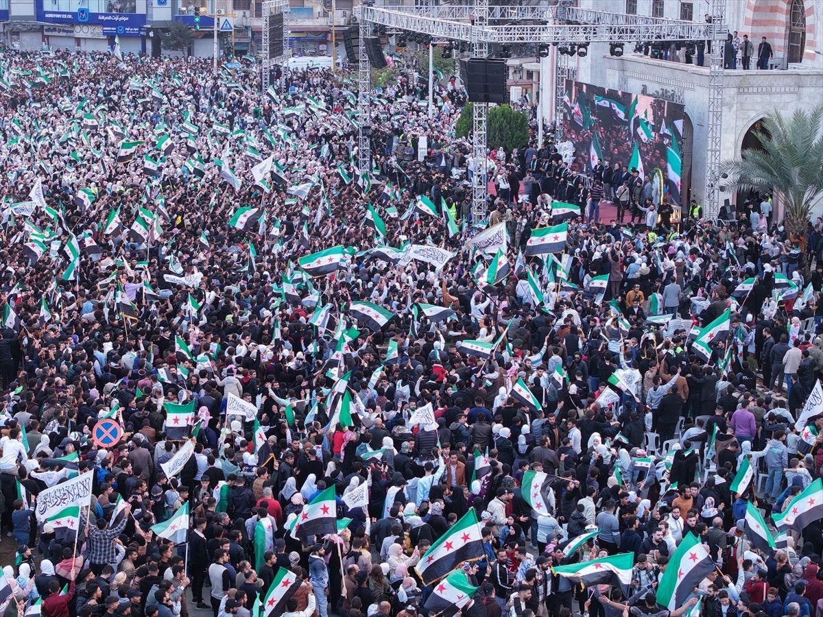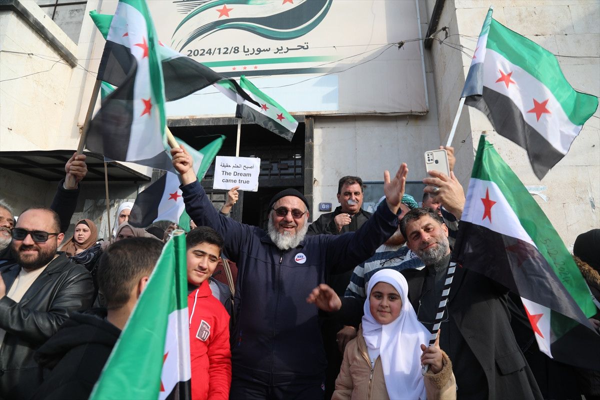 “Özgür Suriye” sloganı atan binlerce kişi, Suriye devrimi ile özdeşleşen çeşitli şarkılar söyleyerek Baas rejiminin devrilmesini kutladı.