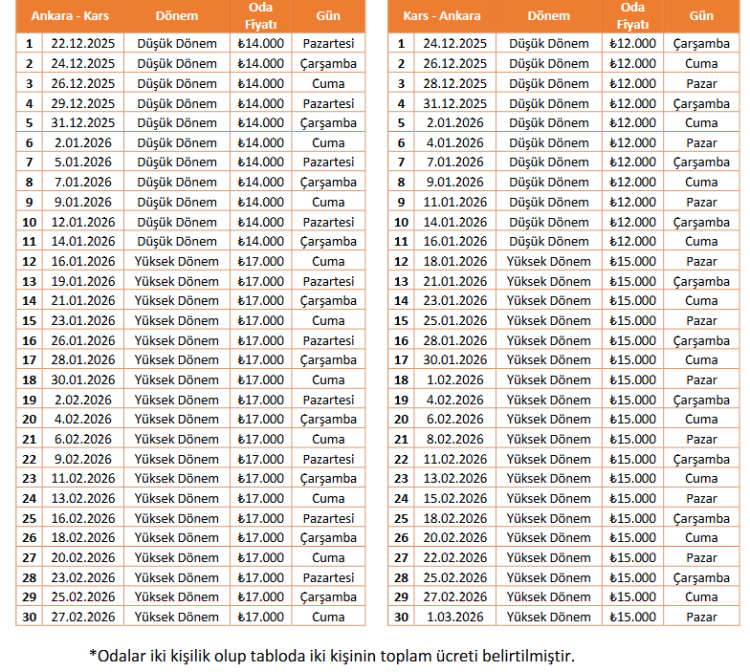 8 Yataklı Vagon + 1 Yemekli Vagon ile her yataklı vagonda 10 kompartımanda 2’şer adet tek kişilik yataktan toplam 160 kişi yolcu kapasiteli trenlerin sefer günleri ve oda ücret tarifesi şöyle: